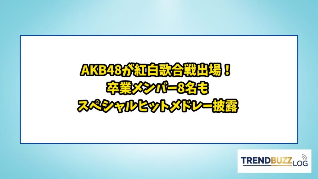 AKB48が2025年紅白歌合戦に紅組出場!卒業メンバー8名も集結 AKB48は、2025年12月31日に放送される『第76回NHK紅白歌合戦』に紅組歌手として出場することが決定しました。20周年を迎える今年、現役メンバーに加え、前田敦子、高橋みなみ、小嶋陽菜、板野友... -