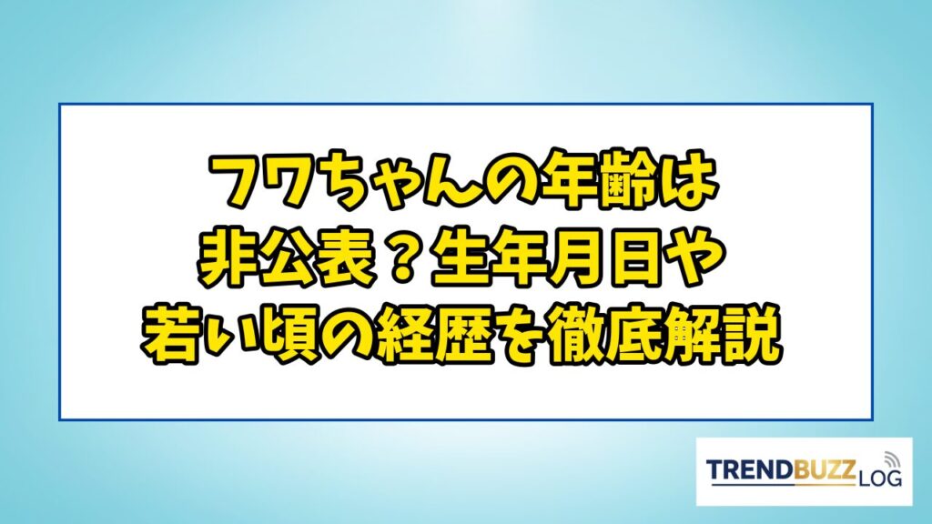 「フワちゃんって今何歳なの?」と気になって検索した方は多いのではないでしょうか。 テレビやYouTubeで圧倒的な存在感を放ってきたフワちゃんですが、公式プロフィールでは「年齢非公表」と記載されていることがほとんどです。 一方で、ネット上には生年... -